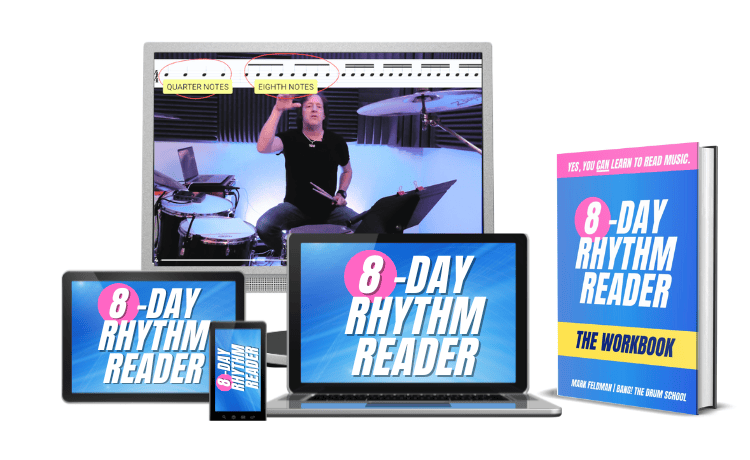 You’ll also play reading exercises for each set of rhythms you learn—along with Mark—at two different tempos in each video. As you and Mark practice together, the notation will appear be on screen with a scrolling red line indicator moving across it so you’ll always understand where you are when a note is being played. This visual aid will help your understanding immensely.
